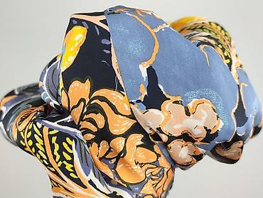 - Wzór i kolor: intensywny, kwiatowy print na ciemnym tle; odcienie żółci, pomarańczu, błękitu i szarości