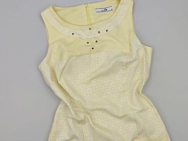 Sukienka damska w kolorze musztardowym - Fason: rozkloszowany, długość przed kolano - Góra: koronkowa, bez rękawów; z tyłu zapięcie na guzik i ozdobne rozcięcie łezka - Dół: gładki, z miękkimi zak...