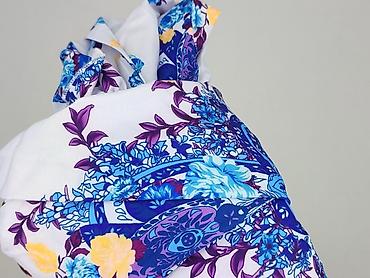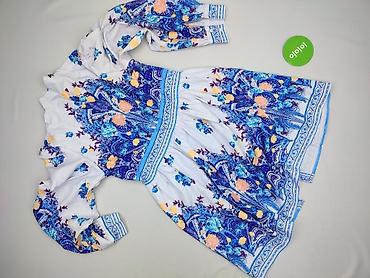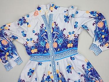 - Wzór: bogaty, kwiatowo‑ornamentalny print w odcieniach kobaltu, błękitu, fioletu i żółci na białym tle; dekoracyjne pasy przy listwie guzikowej, w talii i na dole sukienki