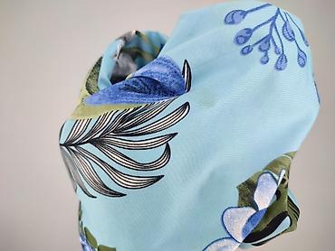 - Wzór: tropikalny print na błękitnym tle – liście monstery, pióra i kwiaty w odcieniach niebieskiego, zieleni i bieli