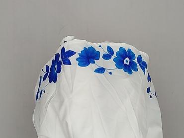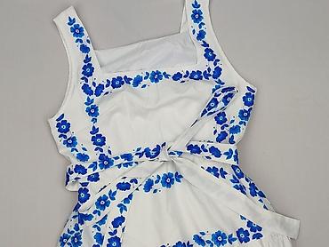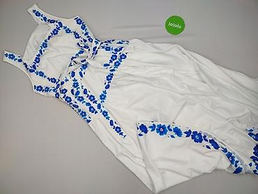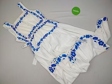 - Wzór: białe tło z intensywnie niebieskimi, kwiatowymi aplikacjami/haftem nadrukowym wzdłuż dekoltu, talii i dołu spódnicy