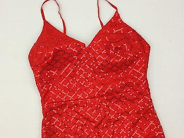 Czerwona sukienka damska na ramiączkach, rozmiar S. - Fason: dopasowany, z marszczeniem po boku, długość mini. - Dekolt: prosty, podwójne cienkie ramiączka. - Materiał: 95% poliester, 5% elas...