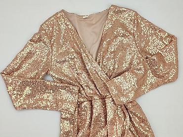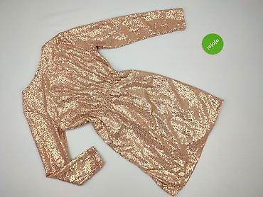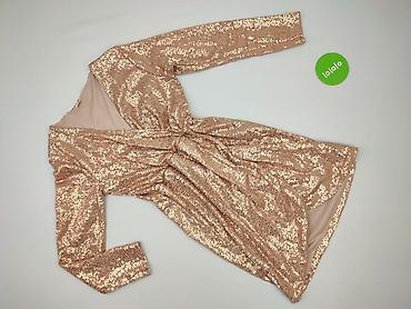 Sukienka damska mini z cekinami, rozmiar S. - Krój: kopertowa góra z głębokim dekoltem V, zaznaczona talia, rozkloszowany dół. - Rękawy: długie, lekko bufiaste na ramionach. - Zapięcie: kryty ...