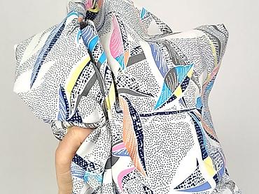 - Wzór: roślinny/liście w wielokolorowej palecie (błękity, żółcie, róż, pomarańcz, granat) na jasnym tle