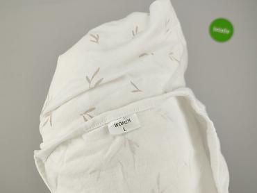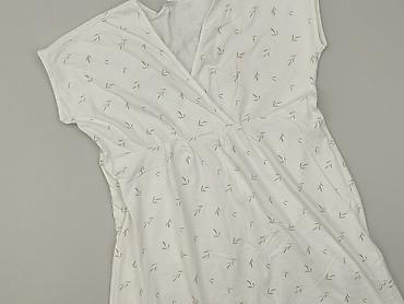 Biała sukienka damska z lekkiego, miękkiego dżerseju w subtelny, beżowy roślinny wzór. Krój z kopertowym dekoltem w serek i lekkim odcięciem pod biustem, który ładnie podkreśla talię i zapewnia wygodę. Krótkie, nietoperzowe rękawki, długość przed kolano. Materiał elastyczny i przewiewny – idealny na lato lub jako wygodna sukienka domowa.