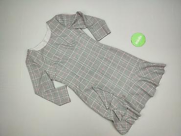 Sukienka damska w kratę (wzór typu glen check) w odcieniach szarości z delikatnymi, kolorowymi akcentami w nitek. Klasyczny, gładki dekolt pod szyję i rękawy 3/4 zakończone falbaną. Fason ołówkowy ...Stan: