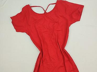Czerwona sukienka damska z krótkim rękawem, rozmiar S. - Fason: ołówkowy, długość midi/przed kolano - Dekolt: okrągły - Rękawy: krótkie, podwijane mankiety - Detal: marszczenie/zakładka w talii, p...