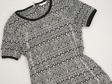 Sukienka damska w paski YFL Resized - Rozmiar: M (metka) - Fason: dopasowany, midi przed kolano, krótkie rękawy do łokcia - Dekolt: szeroki, zaokrąglony - Wzór: czarno-białe poziome paski, c...