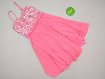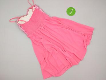 Różowa sukienka damska, rozmiar 40. - Fason: dopasowana u góry, lekko rozszerzana ku dołowi z falbaną/klinami przy dolnej krawędzi - Rękaw: krótki - Dekolt: okrągły - Długość: przed kolano lub do ...