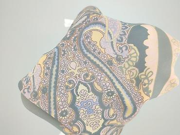 - Kolorystyka i wzór: pastelowy róż z szarością, oliwkowym i jasnym żółtym; dekoracyjny, paisley/ornamentalny nadruk na całej powierzchni