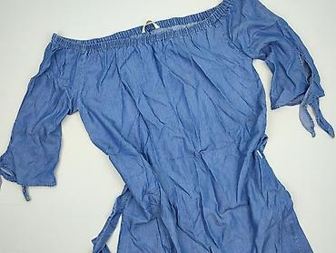 Sukienka jeansowa/denim, damska - Kolor: jasny niebieski (denim) - Fason: luźny, lekko trapezowy - Dekolt: okrągły - Rękawy: odkryte ramiona (cold shoulder) z szerokimi, falbanistymi mankietami - ...