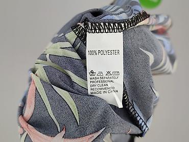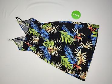 Sukienka damska z krótkim rękawem w intensywny, tropikalny wzór liści na granatowym tle. Najważniejsze informacje: - Rozmiar: 40 (metka widoczna na zdjęciu) - Materiał: 100% poliester - Krój: dop...