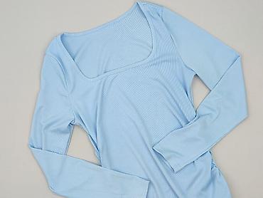 Sukienka swetrowa damska, prążkowana, w kolorze jasnego błękitu. - Fason: dopasowana, elastyczna, z dekoltem kopertowym/na zakładkę; długie, bufiaste rękawy z wąskimi mankietami - Długość: mini (p...