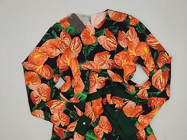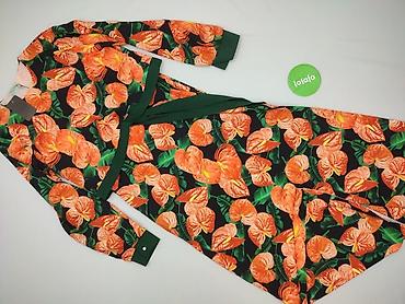 Sukienka damska z krótkim rękawem w intensywny, tropikalny wzór liści na granatowym tle. Najważniejsze informacje: - Rozmiar: 40 (metka widoczna na zdjęciu) - Materiał: 100% poliester - Krój: dop...