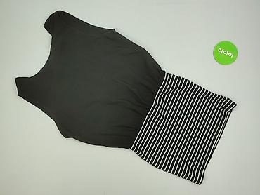 Sukienka damska bez rękawów, dwukolorowa: góra gładka czarna, dół w czarno-białe, wąskie poziome paski. Fason imitujący zestaw top + spódnica; lekko zbluzowana talia. Dekolt drapowany z przodu, tył gładki. Długość przed kolano (mini).