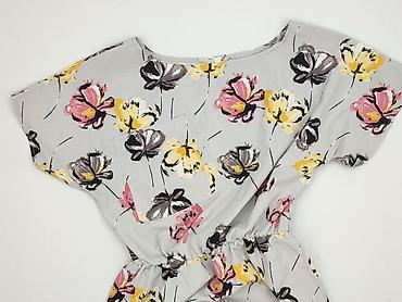 Sukienka damska z lekkiej tkaniny, w szaro-białe kwiatowe wzory. - Krój: prosta, luźna, długość midi. - Dekolt: okrągły, z krótką listwą guzikową z przodu (kilka małych guzików). - Rękawy: 3/4 z de...