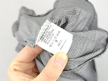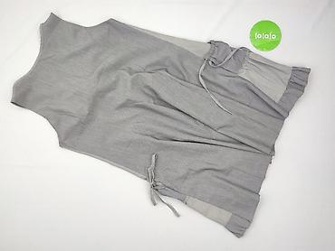 Sukienka damska bez rękawów, w odcieniach szarości, z delikatnym, drobnym prążkiem. Luźny, zwiewny krój z karczkiem przy dekolcie w kształcie łuku i miękkimi marszczeniami z przodu. Dół wykończony szeroką falbaną. Po bokach troczki do regulacji/wiązania, które pozwalają dopasować sylwetkę lub zmienić stopień marszczenia.