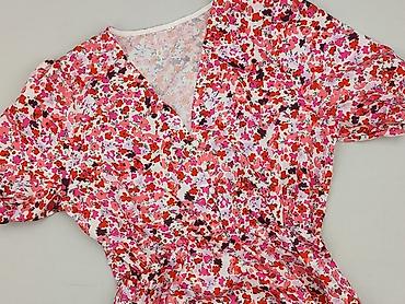 Sukienka damska z kwiatowym printem - Fason: rozkloszowana spódnica, odcięcie w talii - Dekolt: w serek - Rękaw: 3/4 - Długość: midi - Wzór: duże kwiaty w odcieniach czerwieni, łososiowego i różu ...