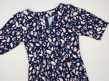 Sukienka damska, rozmiar L - Krój: dopasowany, midi; dekolt w serek, krótkie rękawy typu kimono - Wzór: gęsty, abstrakcyjno-kwiatowy nadruk na granatowym tle (odcienie bieli i jasnego różu) - Mate...
