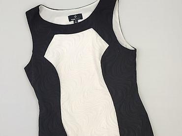 Sukienka damska bez rękawów, czarno‑biała, rozmiar S. - Krój: dopasowana góra z geometrycznymi, kontrastowymi wstawkami w kolorze białym; dół ołówkowy do kolan. - Dekolt: okrągły. - Zapięcie: dług...