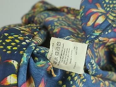 Sukienka damska z krótkim rękawem w intensywny, tropikalny wzór liści na granatowym tle. Najważniejsze informacje: - Rozmiar: 40 (metka widoczna na zdjęciu) - Materiał: 100% poliester - Krój: dop...