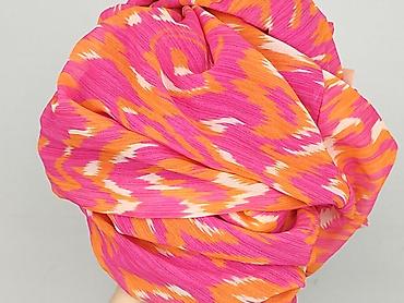 Sukienka damska maxi w energetyczny, etniczny wzór (róż/fuksja, pomarańcz, biel). Model kopertowy z dekoltem w serek, przewiązywany paskiem w talii. Rękawy 3/4 zakończone delikatną falbanką. Dół lekko marszczony, zwiewny.