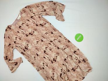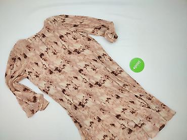 Sukienka damska z nadrukiem w odcieniach różu - Krój: prosta, lekko trapezowa - Długość: do kolan (mini/krótka) - Rękaw: 3/4, zakończony szerokim mankietem - Dekolt: w kształcie litery V z małym r...