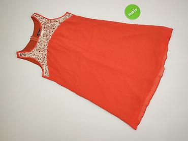 Sukienka damska, rozmiar M, w kolorze koralowo‑czerwonym. - Fason: prosta góra z okrągłym dekoltem, dół z marszczoną falbaną nadającą lekkości. - Rękawy: 3/4. - Długość: przed kolano (wygląda na ...Długość: