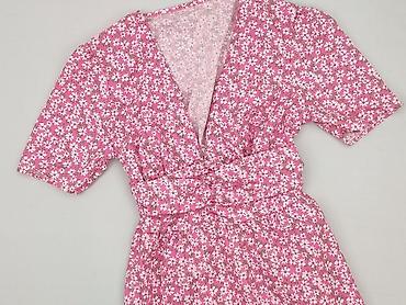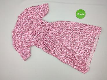 Sukienka damska w kwiaty, rozmiar 38. - Krój: kopertowy dekolt V, odcięcie w talii z delikatną gumką, falbanki na rękawkach i u dołu spódnicy, długość mini/przed kolano. - Wzór/kolor: pastelowy ró...