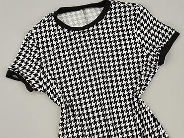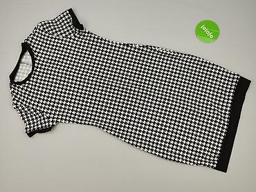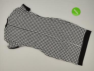 Sukienka damska z krótkim rękawem, czarno-biała, dzianinowa. - Fason: prosta, delikatnie dopasowana, długość przed kolano. - Przód: panel z wzorem w kratę/pied-de-poule w odcieniach czerni i bieli...