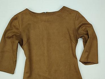 Sukienka damska w kolorze karmelowym/koniakowym z mieszanych materiałów - Krój: prosta, lekko dopasowana, długość do kolan - Rękaw: 3/4 - Dekolt: w kształcie litery V z ozdobnym, metalowym zamkiem...