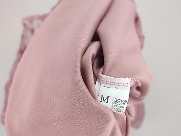 Sukienka damska, rozmiar M - Krój: prosty, długość za kolano, dekolt w serek - Rękawy: krótkie z falbanami; falbana również na dole sukienki - Wzór: złote, metaliczne kropki na pudrowo‑różowym tle...