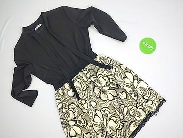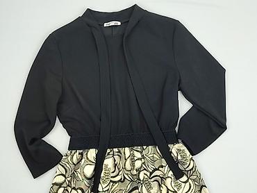 - Elegancka, dwuczęściowa w odbiorze: gładka czarna góra z długim rękawem i wiązaniem przy dekolcie + efektowny, rozkloszowany dół z żakardowym, kwiatowym wzorem.