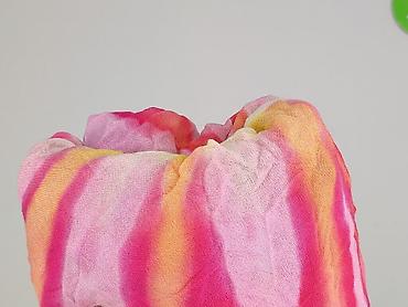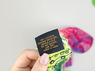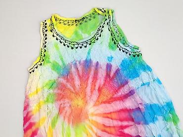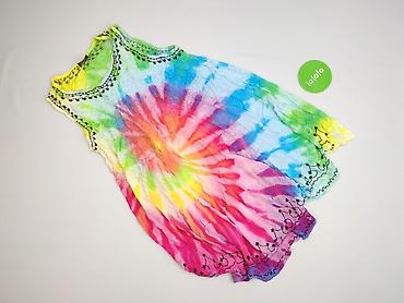 - Kolorystyka: wielobarwny tie-dye (tęczowe odcienie z efektem słońca), czarne dekoracyjne hafty przy dekolcie i u dołu