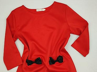 Czerwona sukienka z dzianiny o długości do kolan, ozdobiona dwoma czarnymi kokardkami z przodu. Posiada okrągły dekolt i rękawy o długości trzy czwarte. Prosty krój sprawia, że jest to uniwersalny element garderoby, odpowiedni na różne okazje. Materiał zapewnia komfort noszenia.