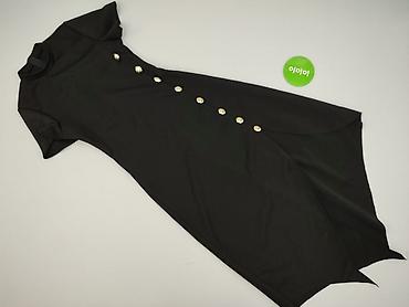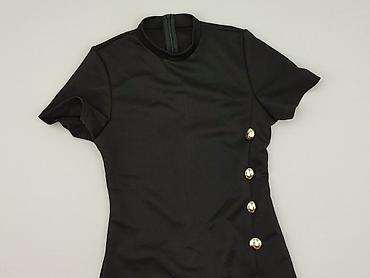 Czarna sukienka damska z krótkim rękawem i wysoką stójką. Fason dopasowany, długość midi z efektownymi, wydłużonymi, asymetrycznymi wycięciami po bokach u dołu. Na przodzie dekoracyjna listwa z dużymi, złotymi guzikami biegnąca po skosie. Z tyłu kryty zamek ułatwiający zakładanie.
