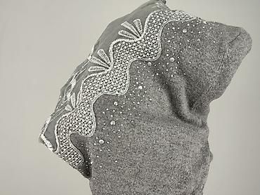 Szara, dzianinowa sukienka swetrowa z długim rękawem. Model o dopasowanym kroju, długość za kolano. Na linii dekoltu i ramion ozdobna aplikacja z białej koronki/przeplotów z drobnymi koralikami, kt...