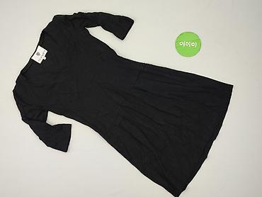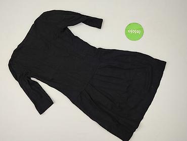 Sukienka damska, czarna, rozmiar S. - Krój: prosta, lekko rozszerzana ku dołowi, długość przed kolano. - Rękaw: krótki. - Kołnierz: szeroki, asymetryczny z ozdobną patką zapinaną na duży guzik. - ...