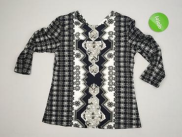 Sukienka damska z krótkim rękawem, wzór czarno‑biały (geometryczny/etyno). - Krój: prosta, lekko dopasowana, długość przed kolano. - Dekolt: okrągły, wykończony czarną lamówką; takie same wykończ...