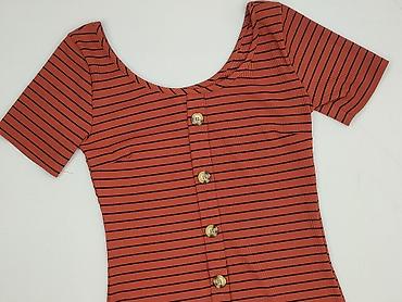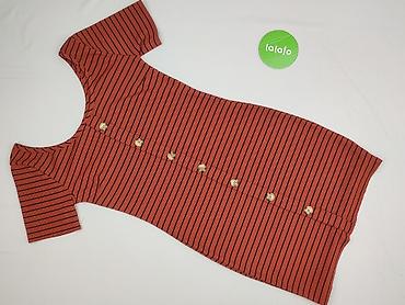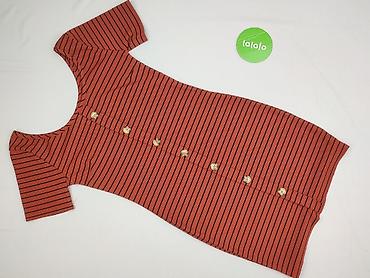 Sukienka damska w paski, dopasowana, z krótkim rękawem i dekoltem typu scoop. Kolor: ceglasty/rdzawy z czarnymi, wąskimi poziomymi paskami. Z przodu ozdobny rząd guzików w kolorze jasnego drewna na całej długości (guziki dekoracyjne, bez funkcji zapięcia). Dzianina prążkowana, elastyczna i miękka.