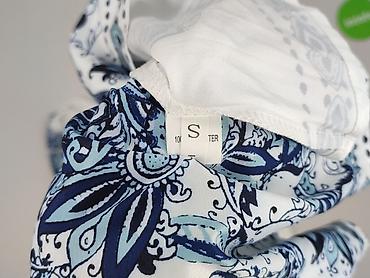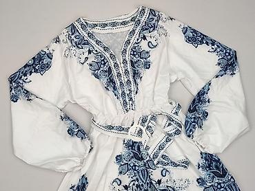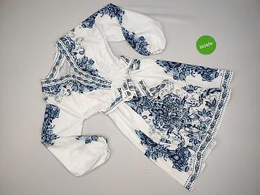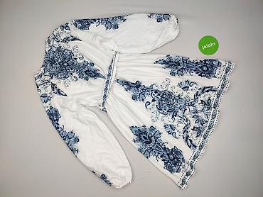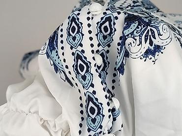 - Wzór: biały materiał z granatowo‑niebieskim, ornamentalnym nadrukiem w stylu paisley/boho.