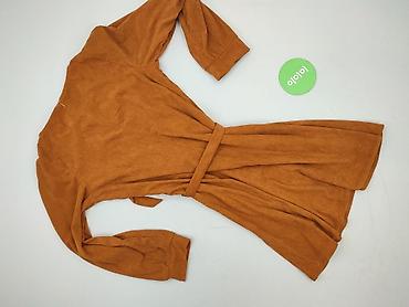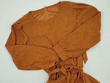 Sukienka damska w kolorze karmelowym/koniakowym z mieszanych materiałów - Krój: prosta, lekko dopasowana, długość do kolan - Rękaw: 3/4 - Dekolt: w kształcie litery V z ozdobnym, metalowym zamkiem...
