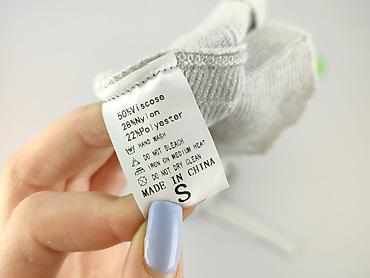 - Materiał: miękka, elastyczna dzianina prążkowana – 50% wiskoza, 28% nylon, 22% poliester (metka na zdjęciu).