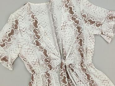 Sukienka damska w panterkę - Wzór: panterka w odcieniach czerni i brązu na jasnym tle - Krój: luźny, z odcinaną talią i delikatnie marszczonym dołem - Dekolt: w serek - Rękaw: krótki, lekko opadaj...