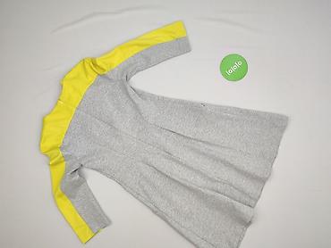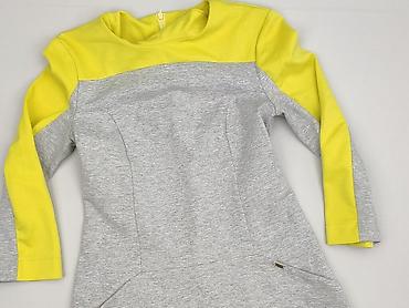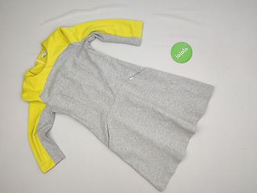 Sukienka damska dzianinowa, szara z neonowo‑żółtymi wstawkami - Krój: prosty, wygodny, długość do kolan - Rękawy: 3/4, wykończone żółtą lamówką - Dekolt: półokrągły z szeroką, neonowo‑żółtą plisą ...
