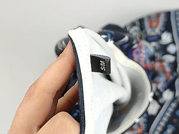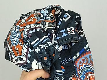 - Wzór: bogaty, etniczno-geometryczny print w kolorach granatu, czerni, bieli, pomarańczu i błękitu