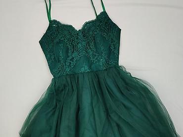 Sukienka koronkowa Sinsay – rozmiar S - Kolor: butelkowa zieleń - Fason: prosta, lekko trapezowa - Materiał: ażurowa, miękka koronka na podszewce (prześwity w górnej części i na rękawach) - Rękawy...