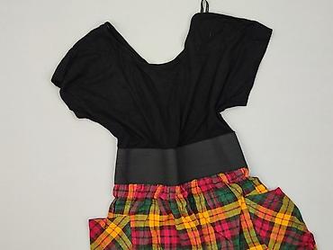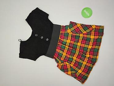 - Fason: gumkowana w talii, góra czarna z krótkim rękawem i trzema dekoracyjnymi guzikami z przodu; spódnica w kolorową kratę (żółty, czerwony, zielony, czarny)