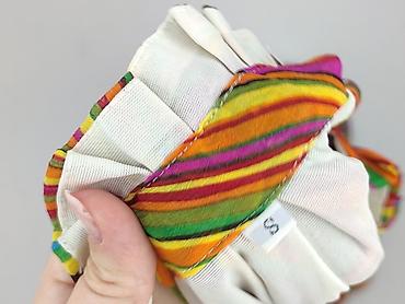 - Wzór i kolor: intensywne, falujące paski w odcieniach żółci, pomarańczu, zieleni, różu, fioletu i niebieskiego – efekt psychodelicznych lat 70., bardzo wyrazisty i energetyczny.