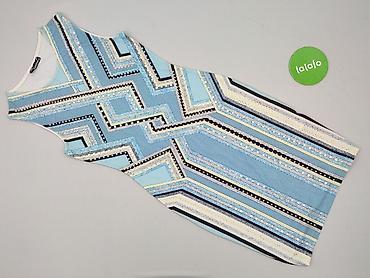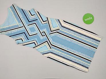 Sukienka damska bez rękawów, rozmiar 34. - Fason: prosta, do kolan, lekko dopasowana, okrągły dekolt z wycięciami i wstawką przy szyi. - Wzór: geometryczny/etno w odcieniach turkusu, błękitu, zie...